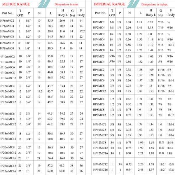 Boyutu: (Tüp End için uygundur) 1/8” OD 1” OD (Tüp End için uygundur) 25mm OD ile 4mm OD